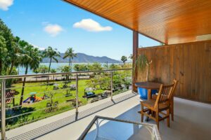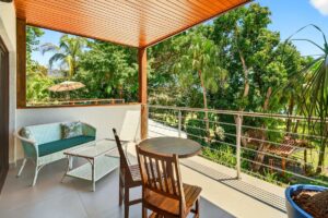 A varanda é ampla e equipada com mesa e cadeiras, sofá que estão disponíveis para relaxar e desfrutar da vista deslumbrante do mar, e o jardim da propriedade.